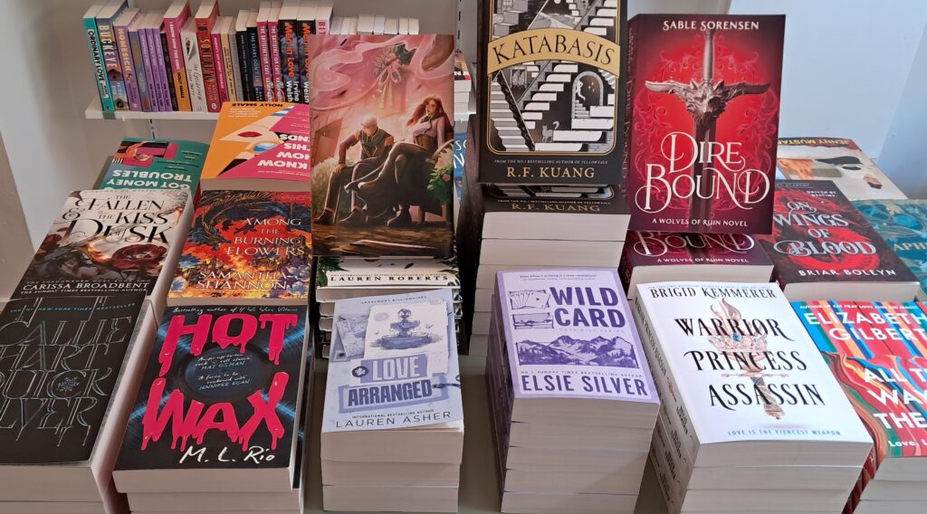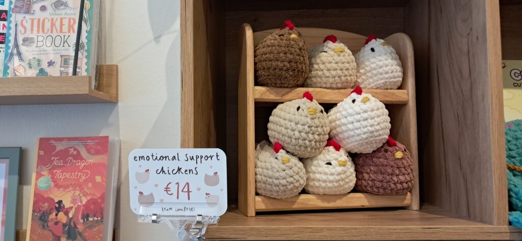 The shop itself is calm and cosy, with tables that are invitingly arranged — not too crowded, allowing every cover to catch your eye. The shelving is logical and easy to browse, grouped by genre in a reader-friendly way. It’s a small space, yes, but one that feels warm, intentional, and personal. In addition to books, the shop also has a small selection of cute curios such as the adorable emotional support chickens..